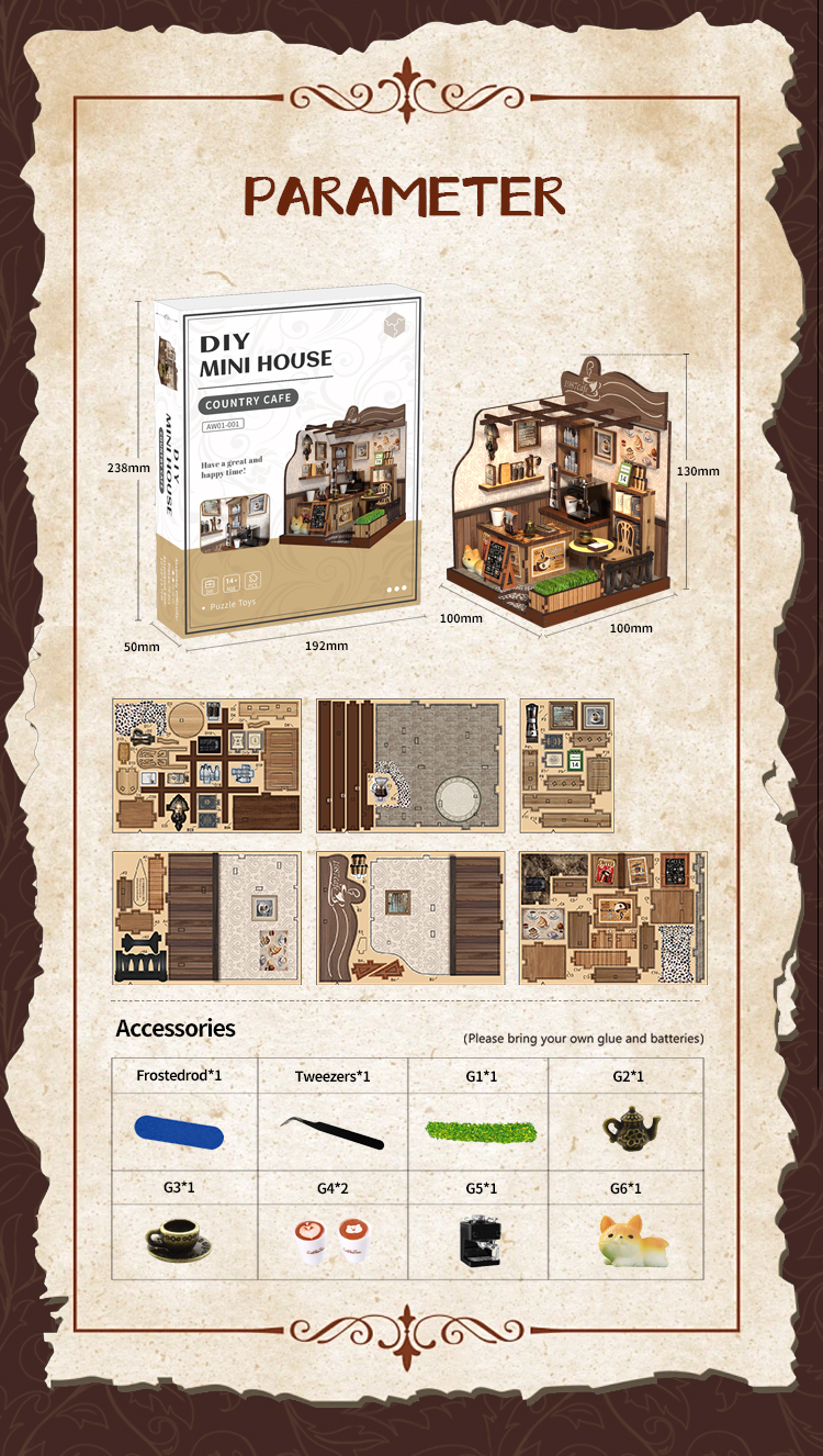 Each kit comes with pre-cut and pre-painted wooden pieces, detailed step-by-step instructions, LED lighting components, and any other specialized materials needed for the scene. Please note that glue is not included due to shipping restrictions.