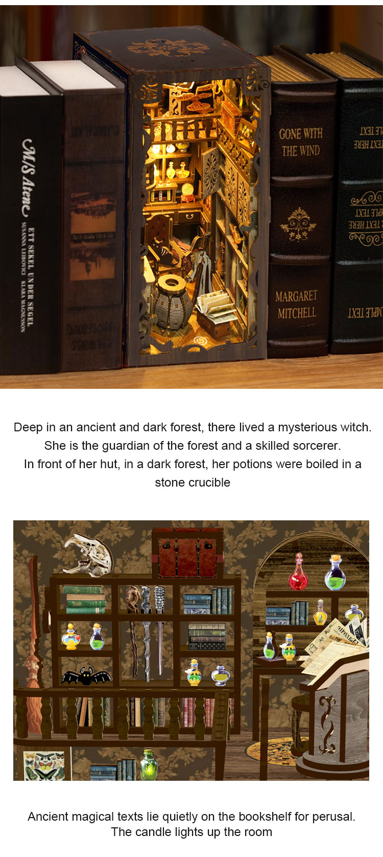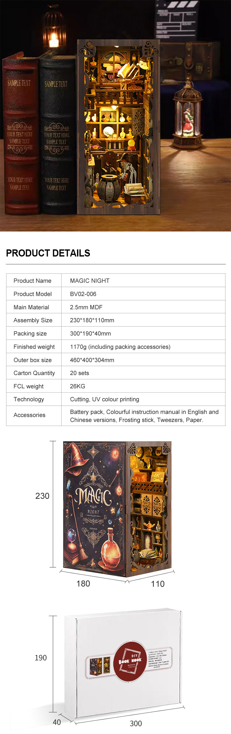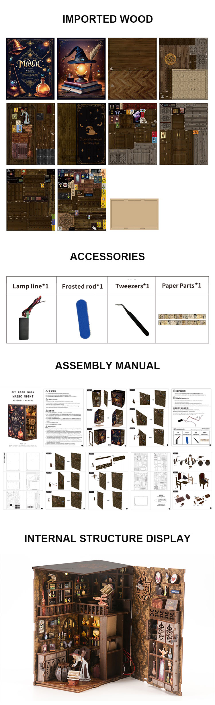 Each kit comes with pre-cut and pre-painted wooden pieces, detailed step-by-step instructions, LED lighting components, and any other specialized materials needed for the scene. Please note that glue is not included due to shipping restrictions.