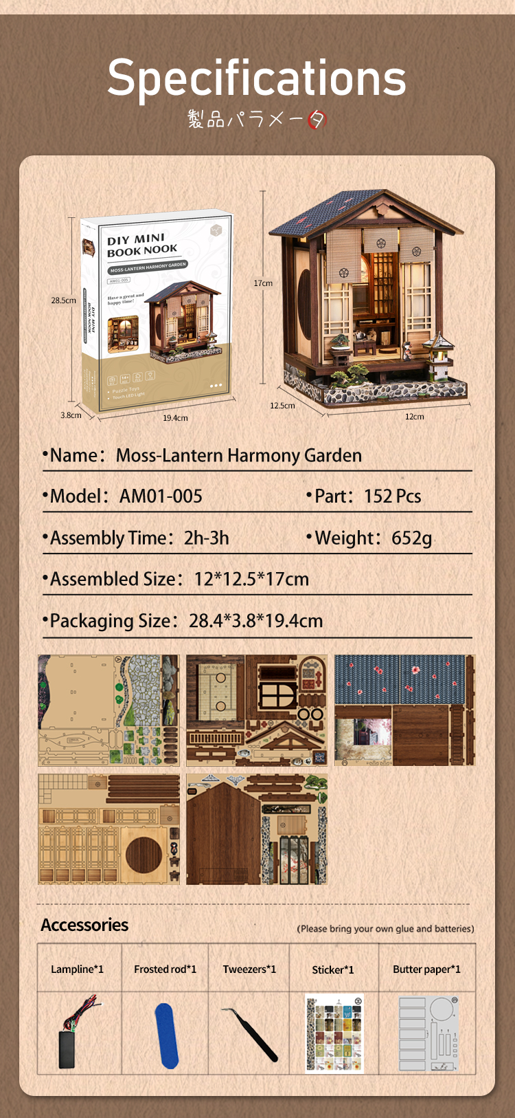 Each kit comes with pre-cut and pre-painted wooden pieces, detailed step-by-step instructions, LED lighting components, and any other specialized materials needed for the scene. Please note that glue is not included due to shipping restrictions.